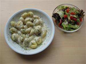 mit Käse-Sahnesauce und Gemüsestreifen , Salat oder Joghurt