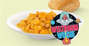 Vegetarisch - Süßkartoffelsuppe mit Kichererbsen und Petersilie, abgeschmeckt mit Orangensaft, dazu ein kleines Brötchen (vegetarisch)