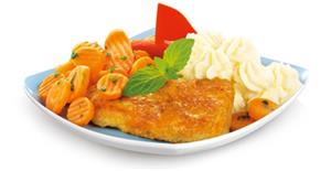 Seelachs im Backteig mit Möhren und Kartoffelpüree
