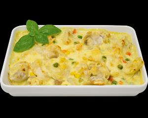 Tortellini mit Rindfleischfüllung in heller Gemüsesoße, garniert mit Käse