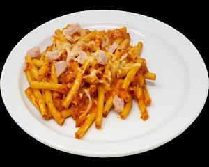 Maccaroniplatte mit fruchtiger Tomatensoße, Putenbrustschinken, garniert mit Käse